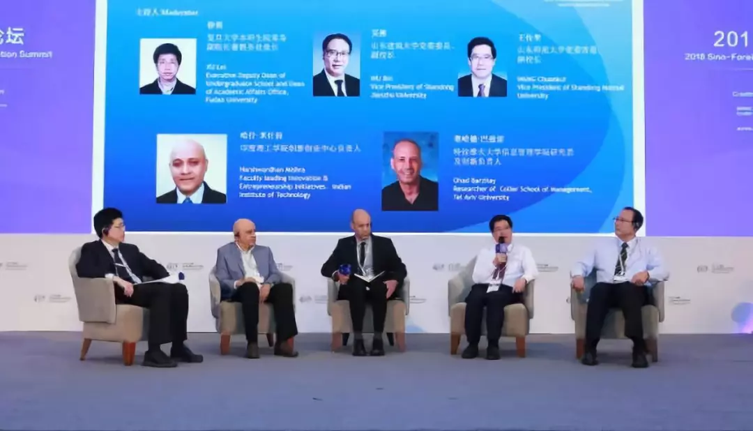从左至右:印度理工学院创新创业中心负责人哈什·米什拉、特拉维夫大学信息管理学院研究员及创新负责人奥哈德·巴兹雷、山东师范大学党委常委、副校长王传奎、山东建筑大学党委委员、副校长吴彬参与讨论
