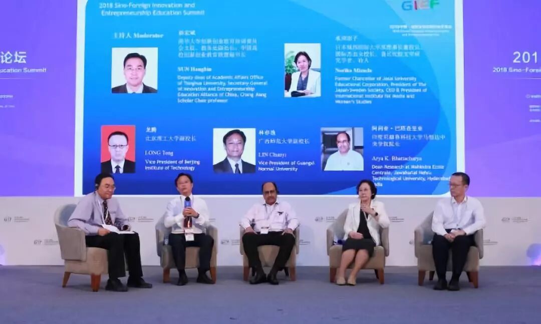 从左至右:广西师范大学副校长林春逸、印度尼赫鲁科技大学马恒达中央学院院长阿利亚·巴塔查里亚、城西国际大学原理事长兼校长、国际杰出女校长水田宗子、北京理工大学副校长龙腾参与讨论