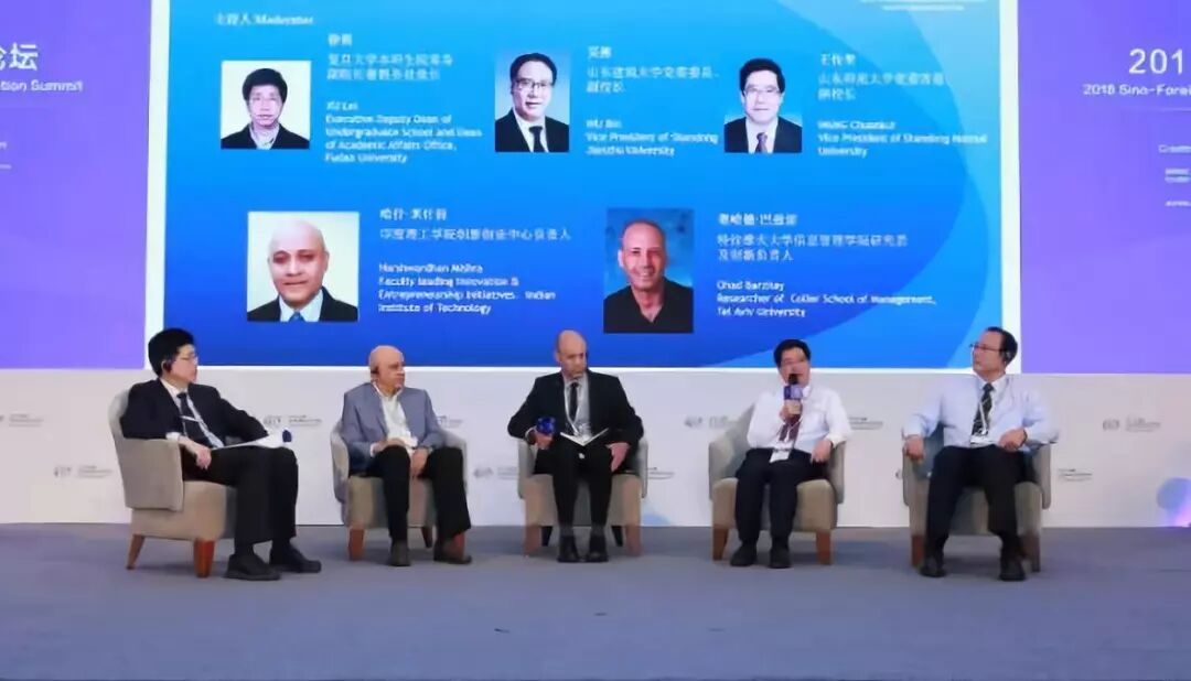 从左至右:印度理工学院创新创业中心负责人哈什·米什拉、特拉维夫大学信息管理学院研究员及创新负责人奥哈德·巴兹雷、山东师范大学党委常委、副校长王传奎、山东建筑大学党委委员、副校长吴彬参与讨论