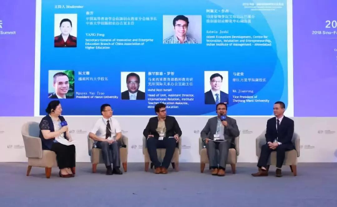 从左至右:浙江万里学院副校长马建荣、印度管理学院艾哈迈达巴德分校创新创业孵化中心副总监阿什文.乔西、马来西亚教育部教师教育研究所国际关系办公室副主任默罕默德·罗智、越南河内大学校长阮文潮参与讨论